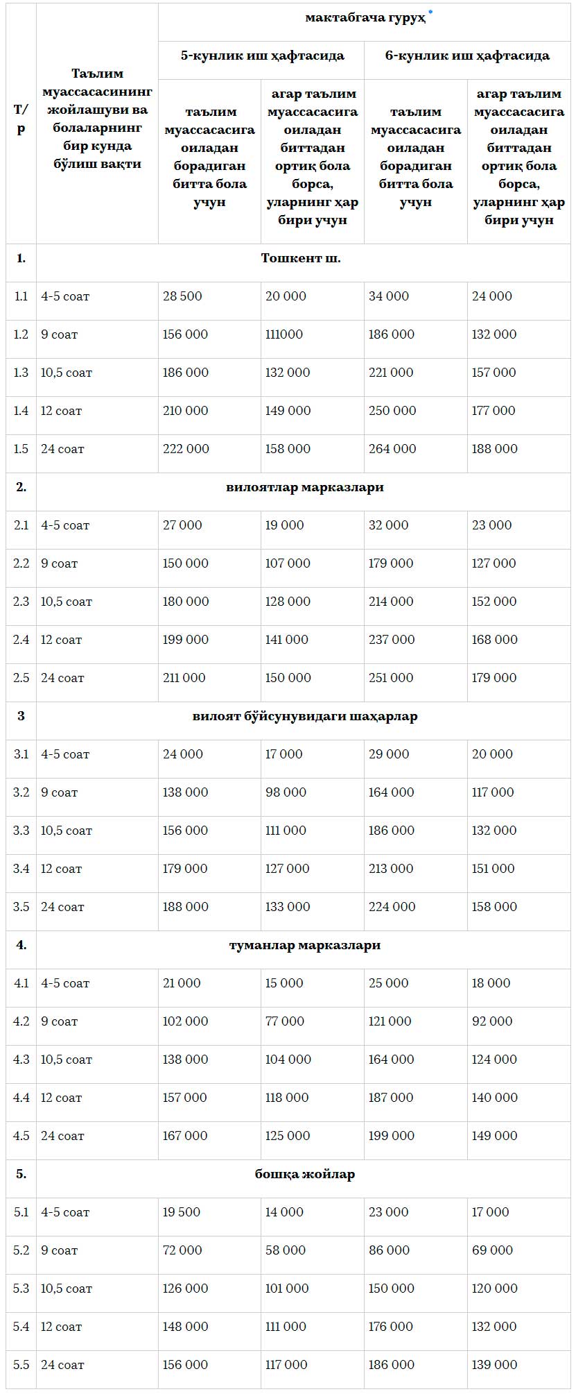 Мағлыўматта жазылыўынша, Қарақалпақстан Республикасында жайласқан мәмлекетлик мектепке шекемги билимлендириў мәкемелеринде балалар тәмийнаты ушын ата-аналардан ҳәр айда алынатуғын төлем муғдарлары орнатылған муғдарға салыстырғанда 50% муғдарында белгиленеди.